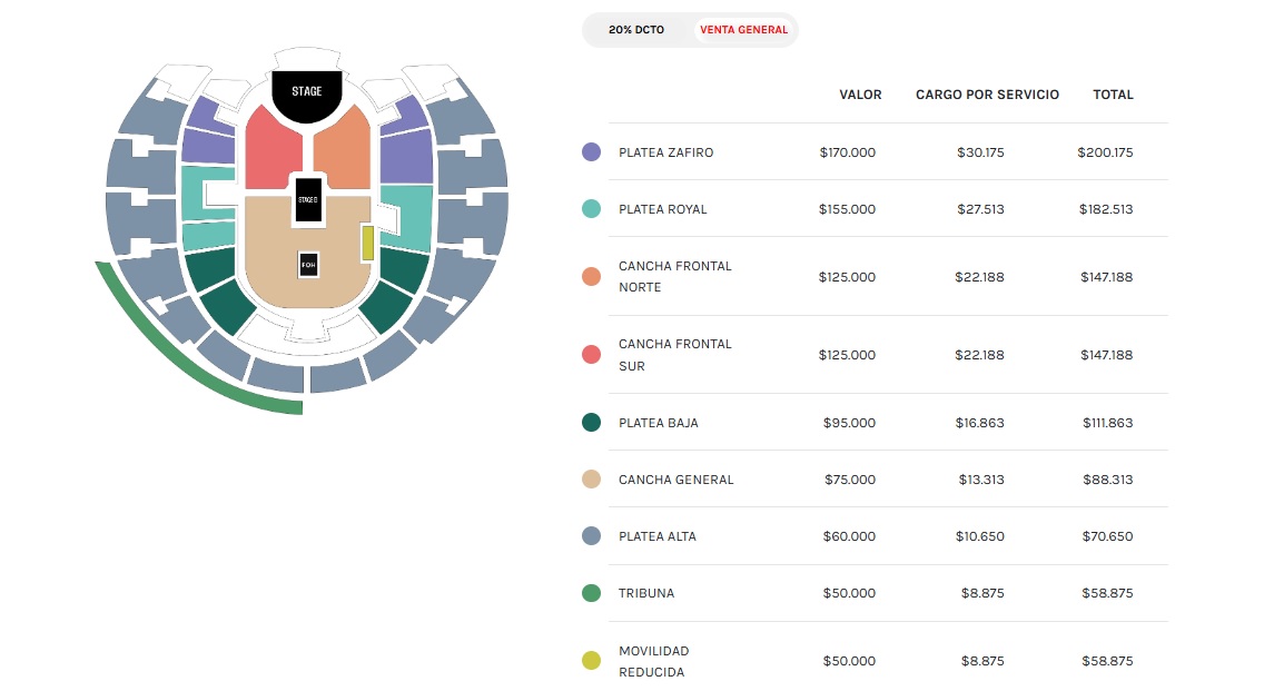 En tanto, en Venta General, van desde los 58 mil 875 pesos con cargo para Movilidad Reducida y Tribuna, hasta 200 mil 175 en Platea Zafiro.